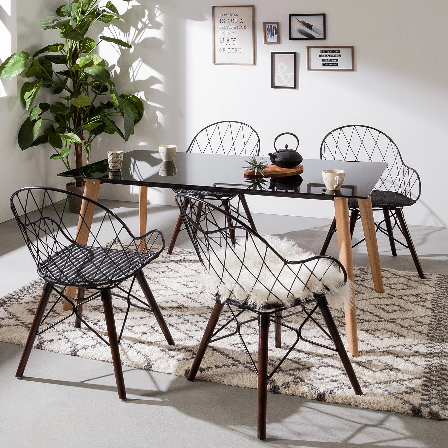 - Coque et structure du siège : noir et assise : rotin noir et pieds : brun foncé